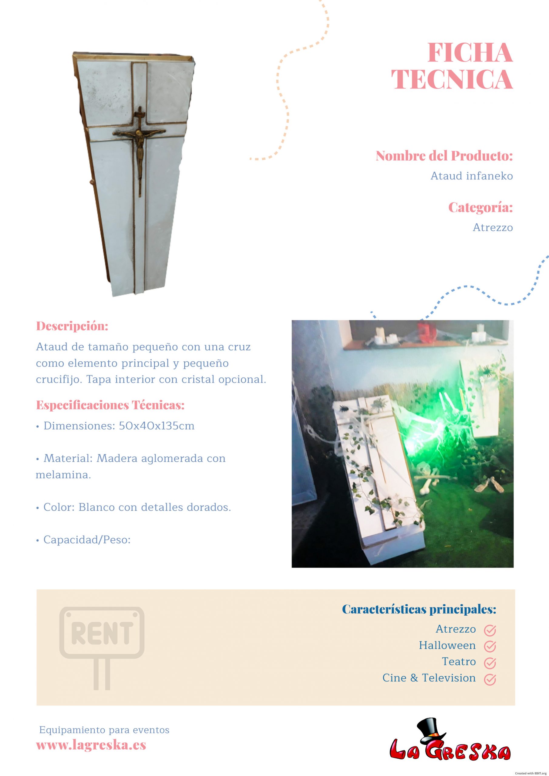 Nuestro ataúd Infanek es una pieza elegante y minimalista que añadirá un toque de serenidad y pureza a tus producciones. Fabricado con materiales de alta calidad y acabado en un blanco impoluto, este féretro es perfecto para recrear escenas llenas de paz y espiritualidad.