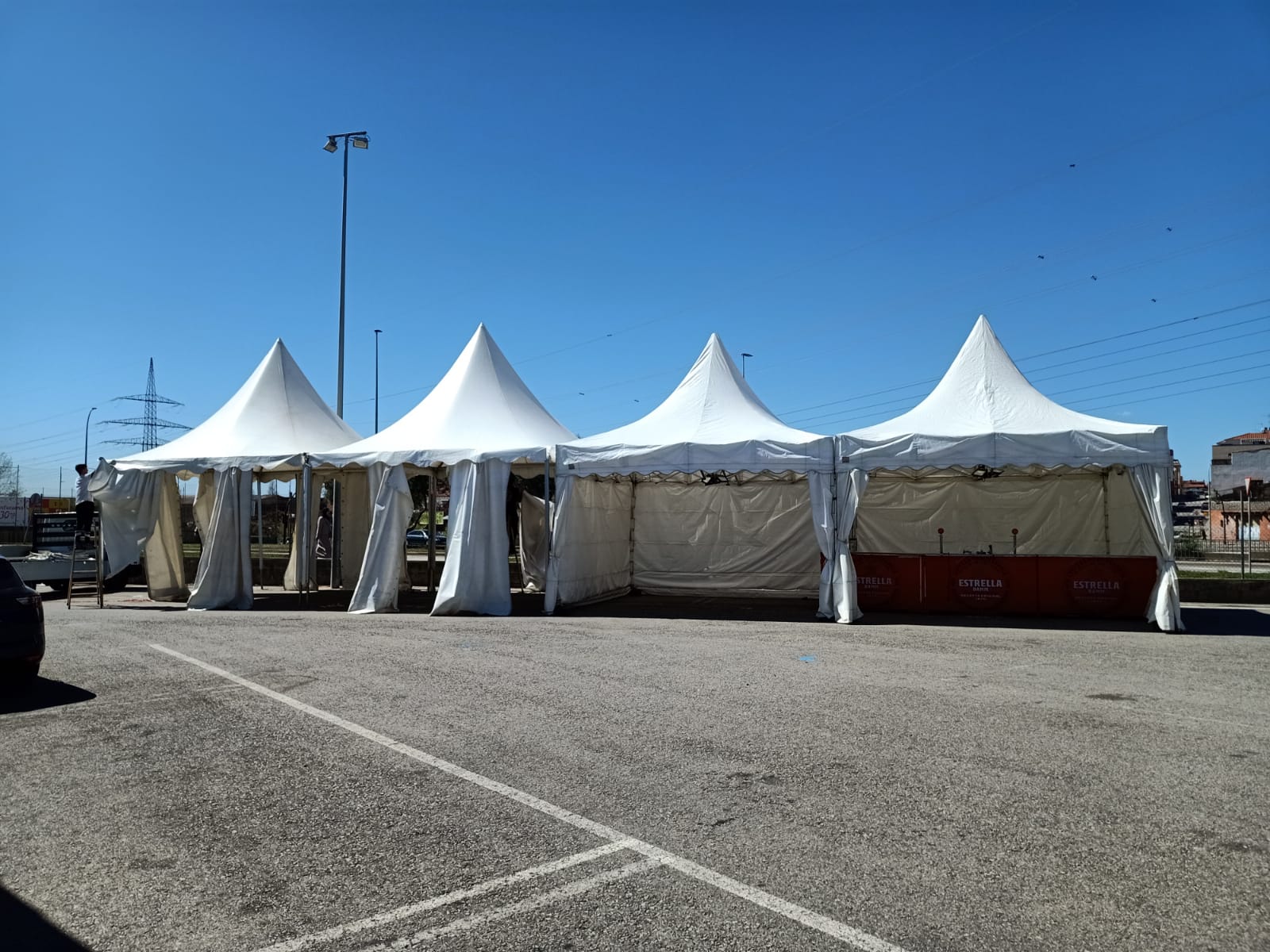 Las carpas Pagodas son las hermanas pequeñas de los pabellones, se pueden cerrar por los laterales o no, a criterio del usuario. Se utilizan mucho para celebraciones familiares, bodas de pequeño formato, estaciones para bodas de gran formato, espacios para catering y para protección de barras de festivales musicales.