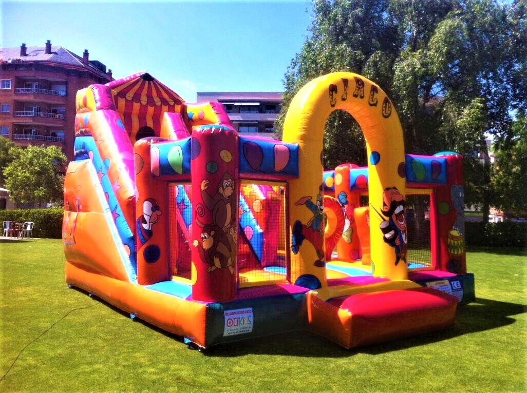 - Incluye: zona de salto, obstáculos inflables y tobogán grande