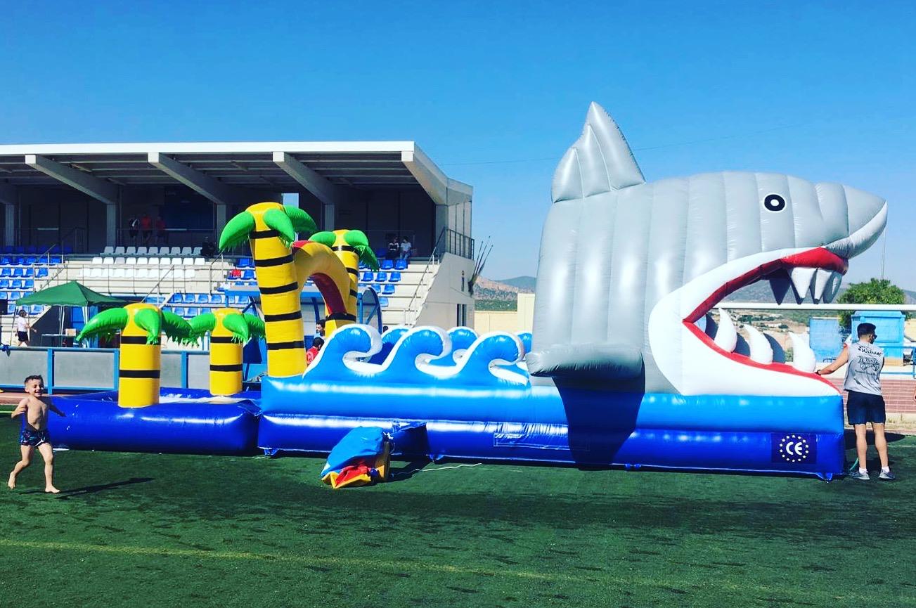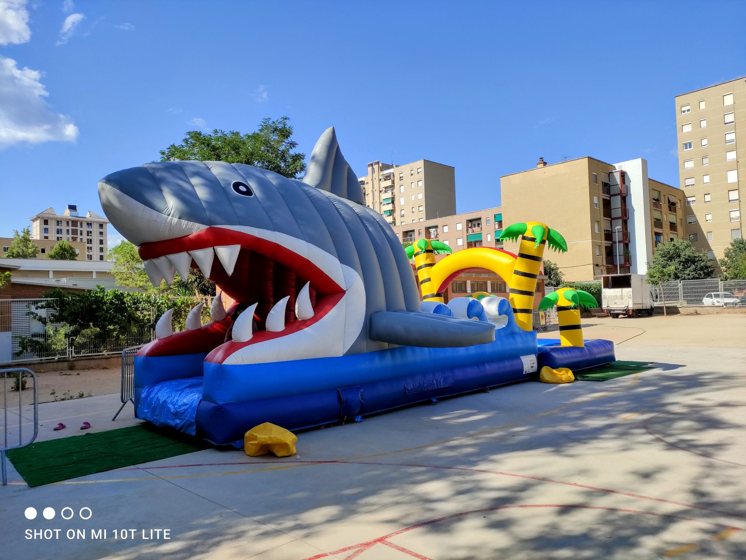 Sumérgete en la diversión con nuestro espectacular hinchable temático de tiburón, una atracción impresionante que combina un gigantesco tiburón con boca abierta para deslizarse, zonas de juego con palmeras y olas, y una refrescante piscina de aterrizaje. Ideal para fiestas de cumpleaños, eventos escolares o cualquier celebración veraniega, este hinchable garantiza horas de emoción y chapuzones inolvidables en un entorno seguro y vibrante.