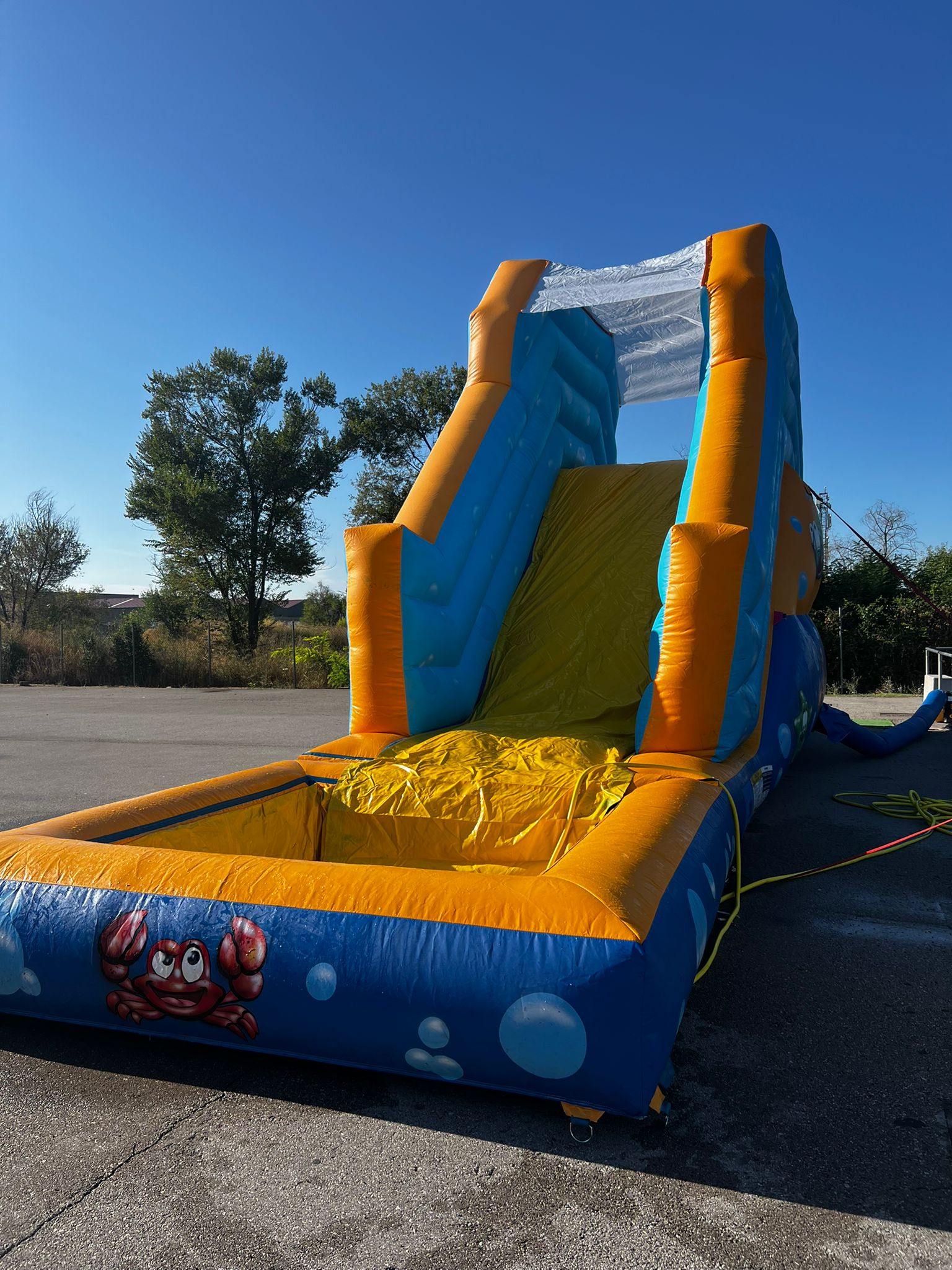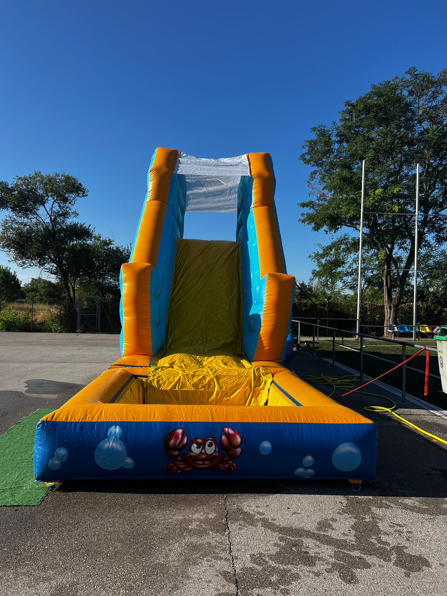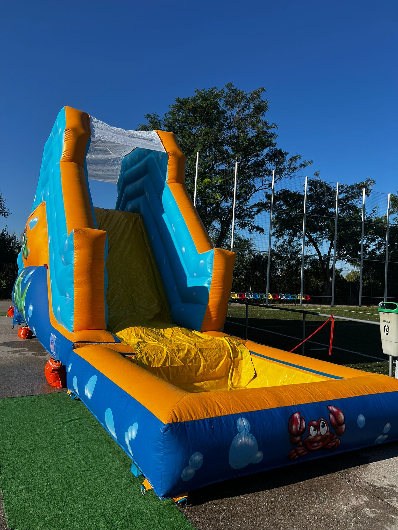 Prepara a los niños para un verano inolvidable con nuestro vibrante hinchable acuático. Con un diseño de tonos azules y naranjas, y adornos de simpáticos peces y cangrejos, ¡la diversión submarina está garantizada!