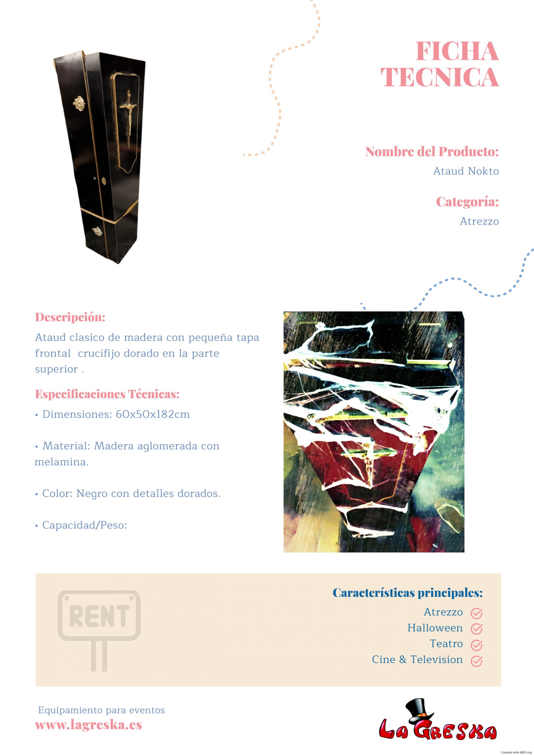 El nostre taüt Nokto és una peça impactant que afegirà un toc d'elegància i misteri a les produccions. Fabricat amb materials d'alta qualitat i acabat en negre intens, aquest fèretre és perfecte per recrear escenes plenes de drama i suspens.