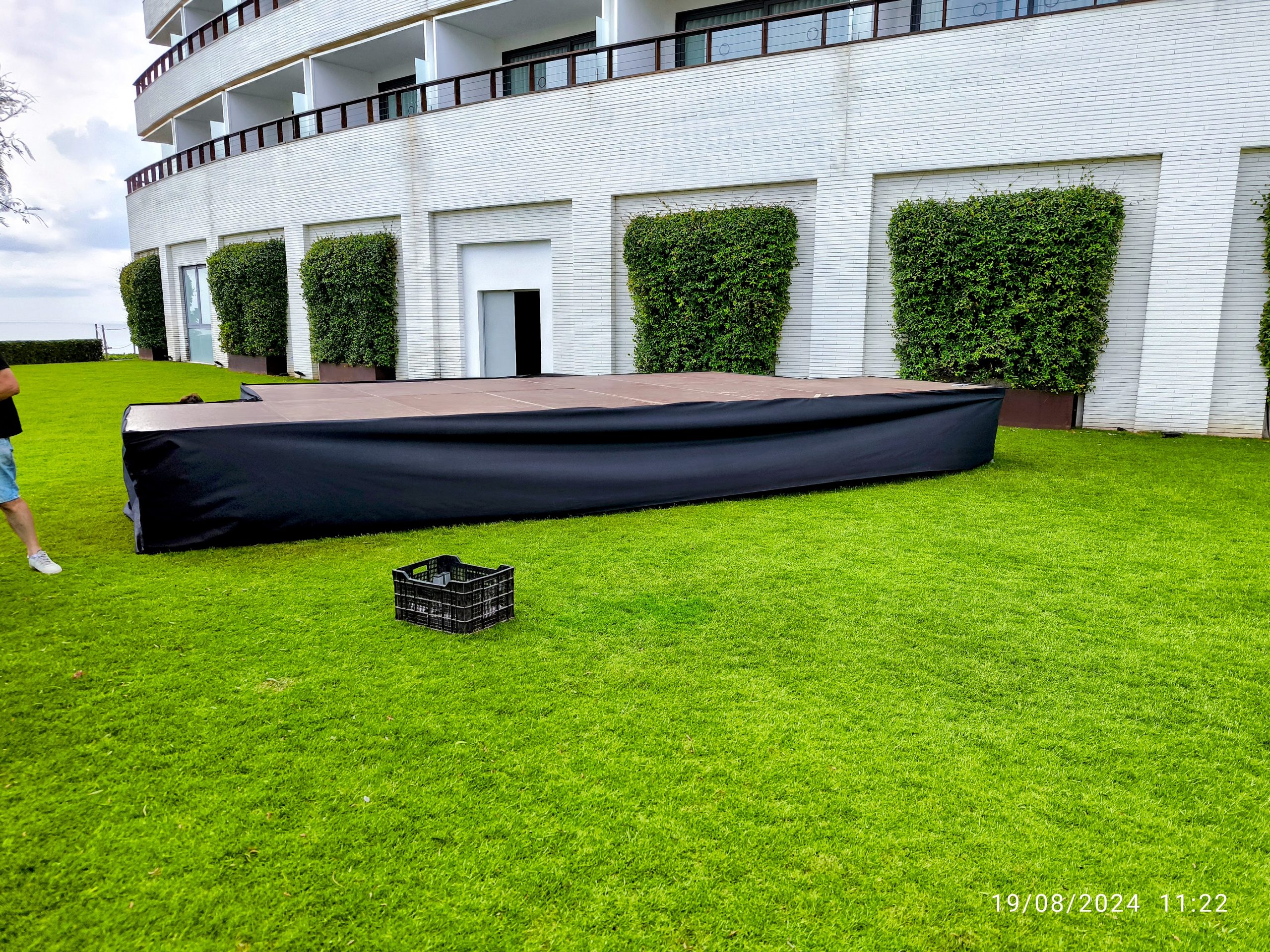 Són escenaris ideals per a tot tipus d'esdeveniment i superfície. Instal·lats amb plataformes de fusta i alumini, es poden instal·lar els diferents peus o rodes. Sobre de fusta fenòlica de bedoll de fabricació europea, Alçada d'emmagatzematge: 8cm. Pes: 42 Kg. Mesures, formes (angles) i curvatures a mida són possibles.