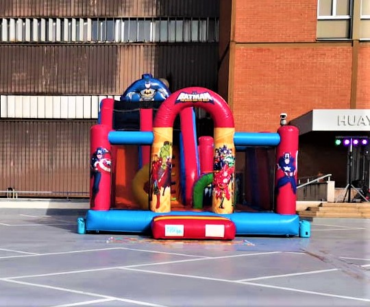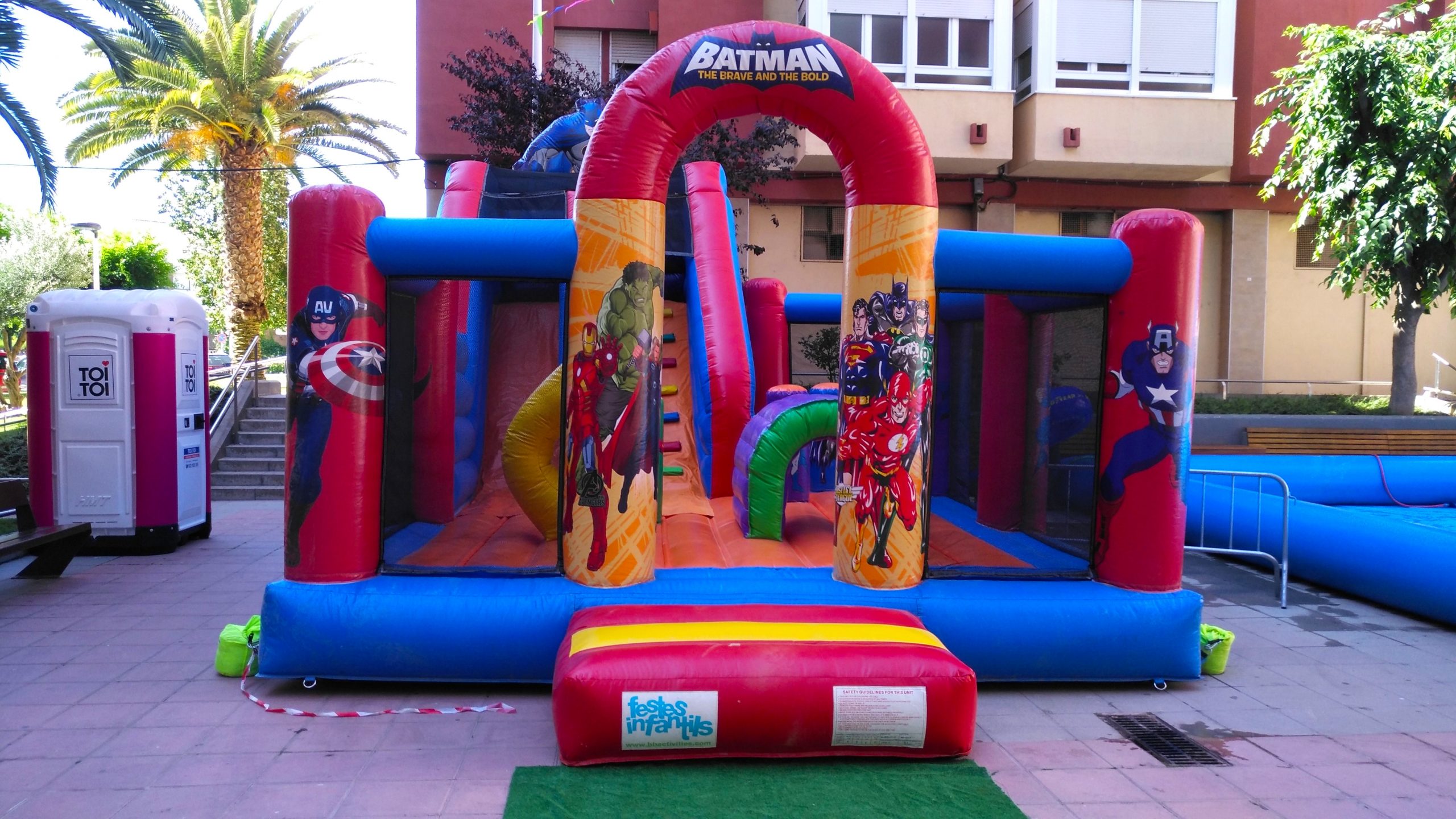 Ideal per a qualsevol esdeveniment que necessiti una atracció principal d'alt impacte, aquest Inflable Multijoc de Superherois combina un disseny vibrant amb la màxima funcionalitat. L´estructura incorpora un gran arc temàtic de Batman i està decorada amb gràfics d´alta qualitat dels personatges més icònics. Inclou una àmplia àrea de rebot, una paret d'escalada i un tobogan per mantenir els nens actius i entretinguts per hores. La seva gran mida ho fa perfecte per a festivals, fires i celebracions amb gran afluència.