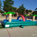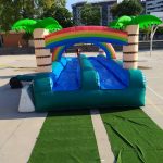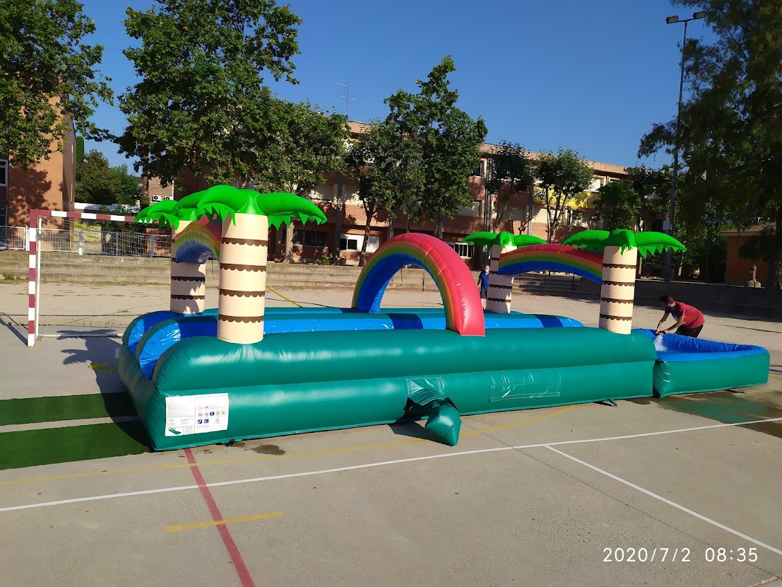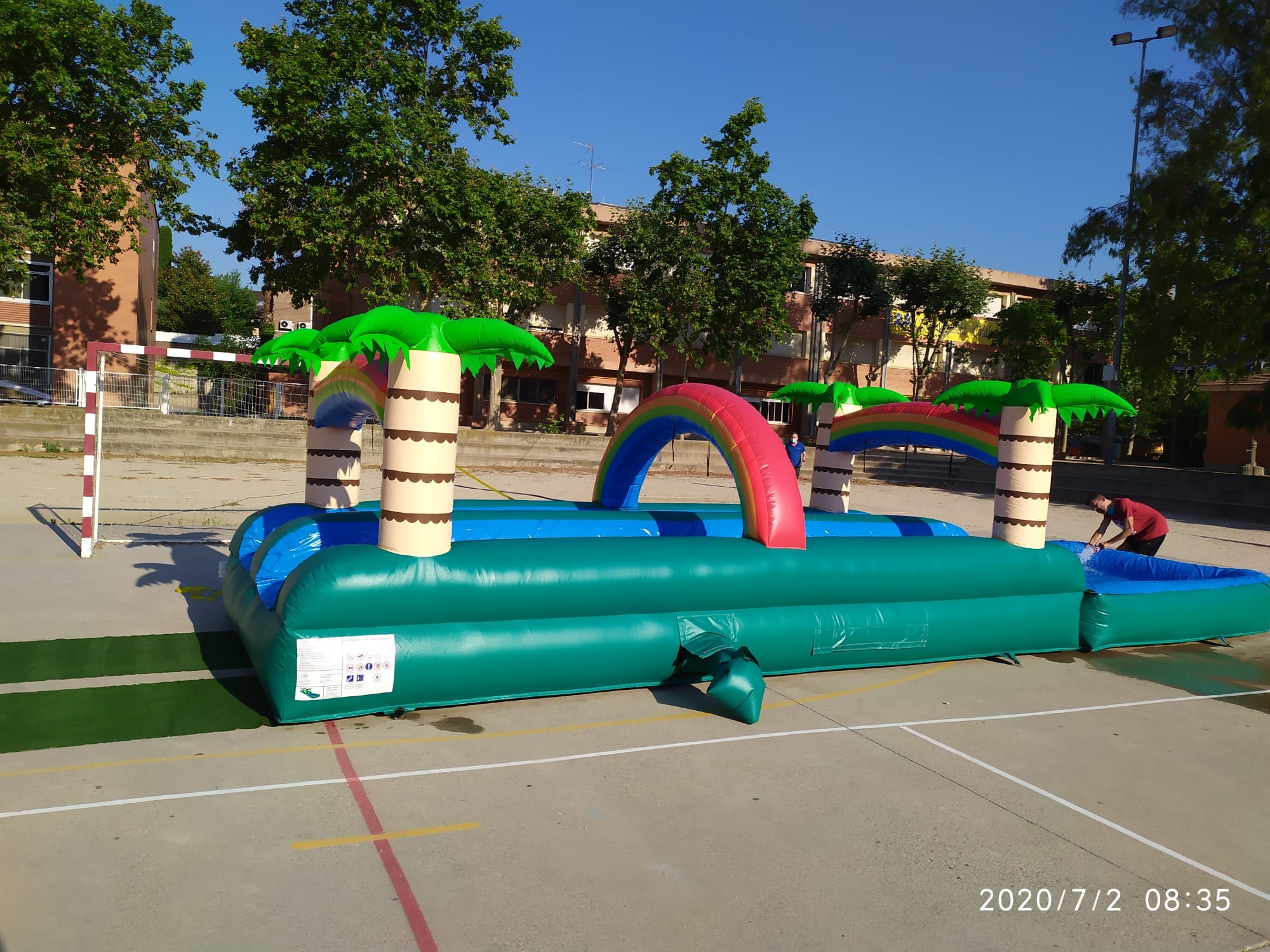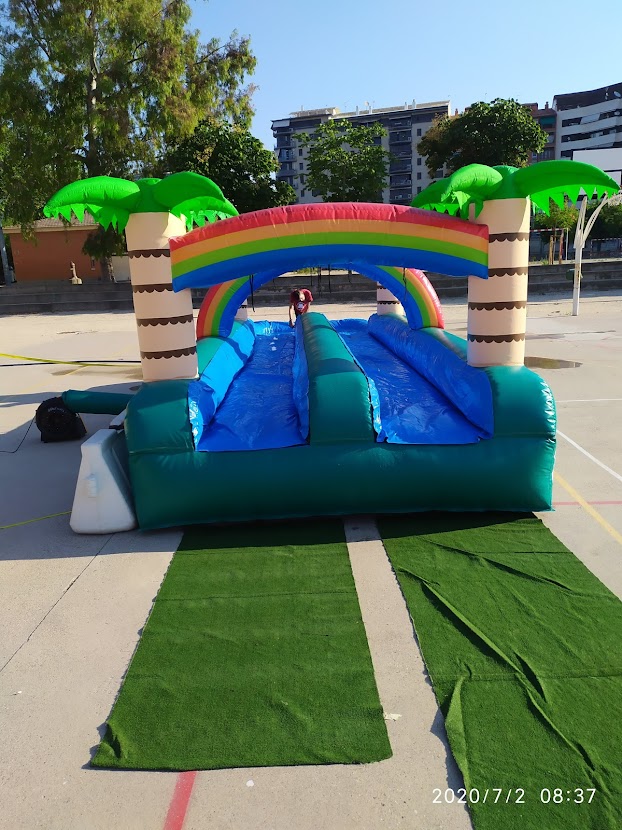 Transforma el teu esdeveniment en un oasi amb el nostre inflable de doble pista, decorat amb palmeres i arcs iris. Perfecte per a refrescants carreres i capbussades!