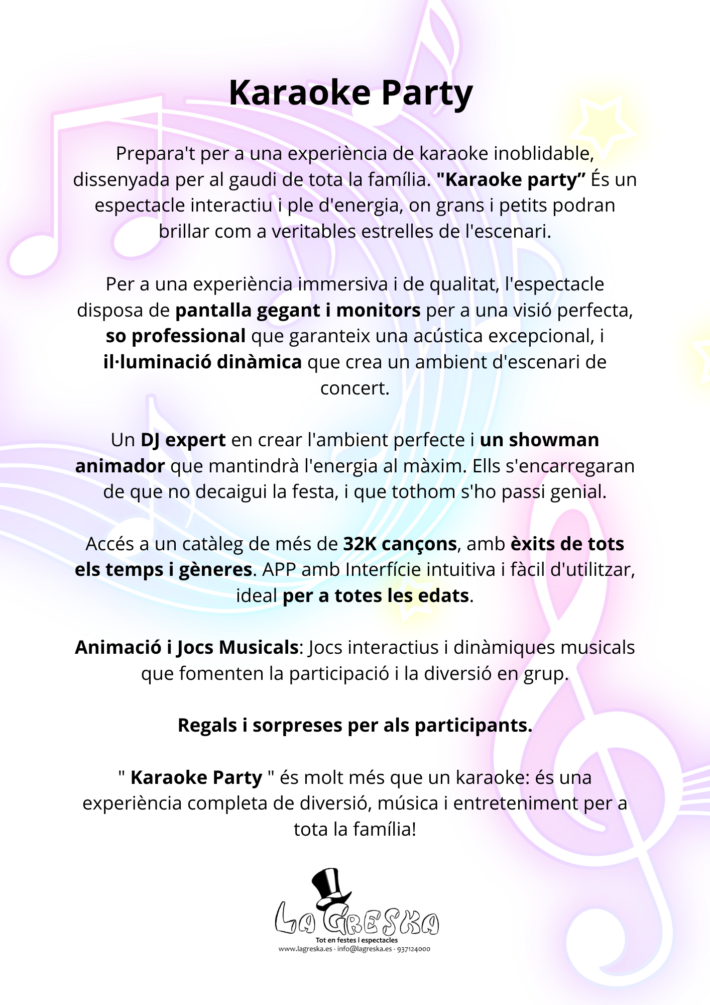 Prepárate para una experiencia de karaoke inolvidable, diseñada para el disfrute de toda la familia. Karaoke Party es mucho más que un simple karaoke: es un espectáculo interactivo y lleno de energía donde grandes y pequeños podrán brillar como verdaderas estrellas sobre el escenario.+3